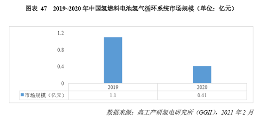 從市場(chǎng)規(guī)模來(lái)看,2020年國(guó)內(nèi)氫循環(huán)系統(tǒng)的市場(chǎng)規(guī)模預(yù)計(jì)為0.41億元,同比2019年下降了63%,下降原因主要是出貨量減少和氫循環(huán)泵價(jià)格的下降。