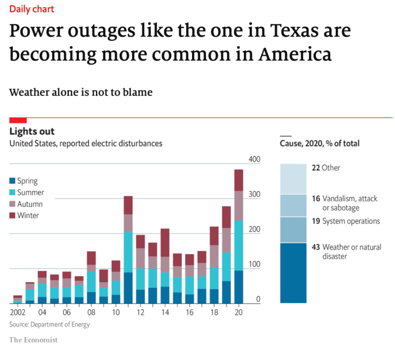 美國(guó)能源部的數(shù)據(jù)顯示,美國(guó)在2020年遭受了383起“電力干擾事件”,大大高于2017年的150起。當(dāng)電力公司和電網(wǎng)運(yùn)營(yíng)商滿足某些條件時(shí),如電力損失嚴(yán)重或是遭受網(wǎng)絡(luò)攻擊,他們必須向能源部報(bào)告此類事件,原因包括人為破壞、燃料供應(yīng)和地震。極端天氣也可能導(dǎo)致停電,因?yàn)槿∨蚩照{(diào)將用電需求推高到了電網(wǎng)無法承受的程度。但是根據(jù)美國(guó)能源部的數(shù)據(jù),在春季和秋季停電更為頻繁,這表明去年美國(guó)停電激增的背后不僅僅是天氣原因。