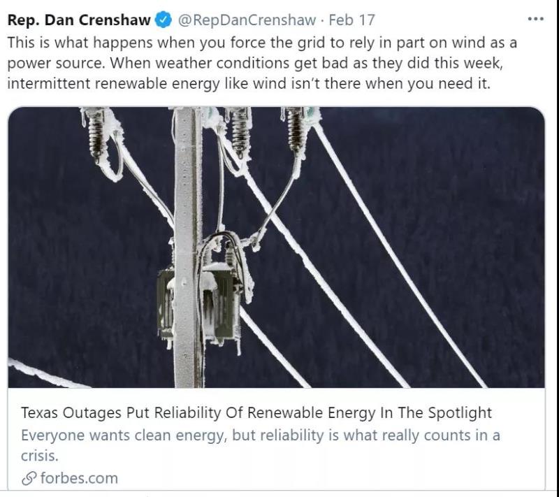 據(jù)《經(jīng)濟(jì)學(xué)人》報(bào)道,美國(guó)德克薩斯州的共和黨眾議員丹·克倫肖(DAN CRENSHAW)在2月17日的推特上說:“間歇性的可再生能源,如風(fēng)能,在你需要的時(shí)候是不存在的。”