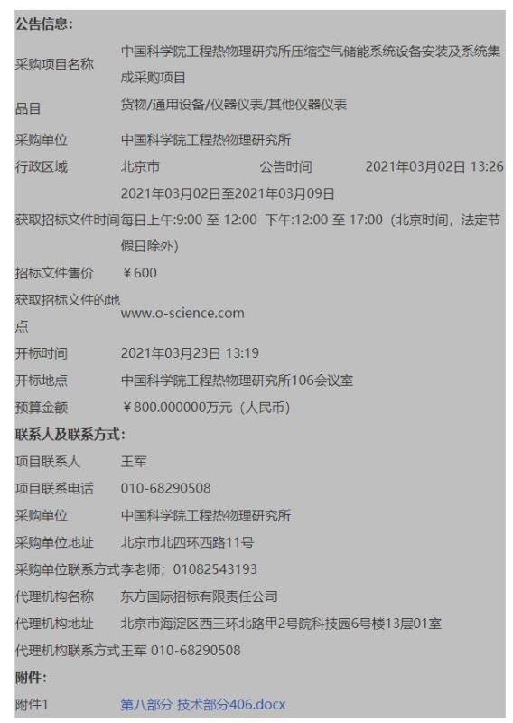 中國科學院工程熱物理研究所壓縮空氣儲能系統(tǒng)設備安裝及系統(tǒng)集成采購項目 招標項目的潛在投標人應在www.o-science.com獲取招標文件,并于2021年03月23日 09點30分(北京時間)前遞交投標文件。