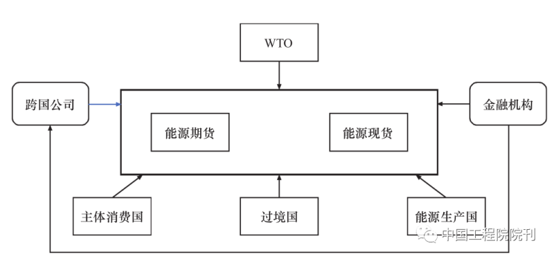 能源作為一類商品在世界范圍內(nèi)流通和貿(mào)易,從市場觀點出發(fā)進行能源問題分析具有重要價值。能源在市場中的主要形式有能源商品的現(xiàn)貨貿(mào)易、期貨貿(mào)易和能源技術的合作共享。世界能源貿(mào)易體系由能源生產(chǎn)國、過境國和主體消費國構成,國際組織如世界貿(mào)易組織(WTO),架構在上層進行統(tǒng)一指導和協(xié)調(diào)(見圖3)。與此同時,金融機構作為金融市場的重要參與者和中介服務機構參與到能源貿(mào)易中;部分跨國公司由于自身業(yè)務涉及全球多個地區(qū)的市場,在國際貿(mào)易中能夠提供增值服務或具備參與優(yōu)勢,也會參與到能源貿(mào)易中。以WTO為代表的國際組織作為最上層的能源貿(mào)易協(xié)調(diào)和管理體系,對整個貿(mào)易條款的簽訂、貿(mào)易的實施環(huán)節(jié)進行管控。