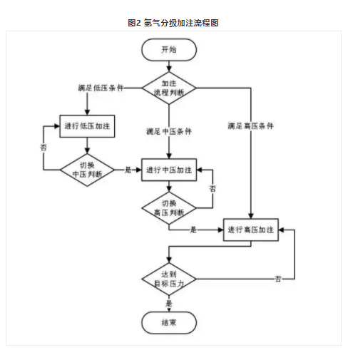 其中,氣源階梯切換的判斷常以氣瓶?jī)?nèi)平均壓力變化速率為依據(jù),進(jìn)而可按照低級(jí)瓶組到中級(jí)瓶組再到高級(jí)瓶組的順序從各級(jí)儲(chǔ)氫罐中取氣,按照此方式也提高了各級(jí)儲(chǔ)氫罐中的氫利用率。氫氣的分級(jí)加注流程如圖2所示。