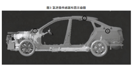 氫泄露傳感器的布置如圖3所示,圖中傳感器布置在了后備箱的最高點(diǎn)①、乘客艙②和前機(jī)艙③附近,有的傳感器布置方案也在儲(chǔ)氫瓶口處增設(shè)氫傳感器。