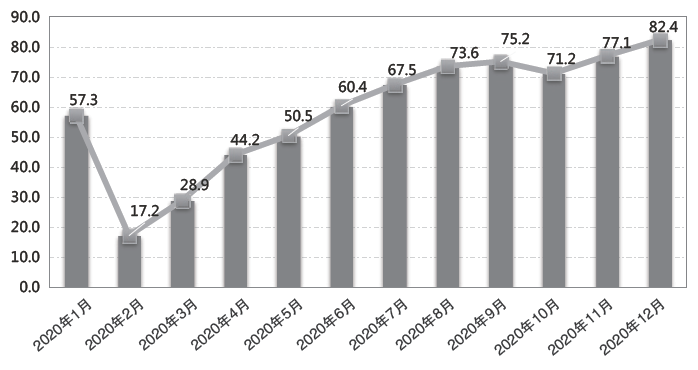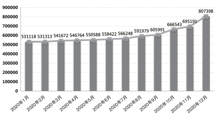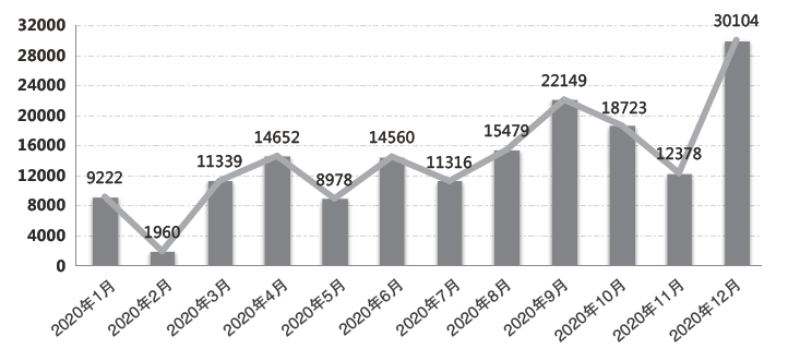 圖1 2020年各月公共充電樁保有量情況(單位:臺)