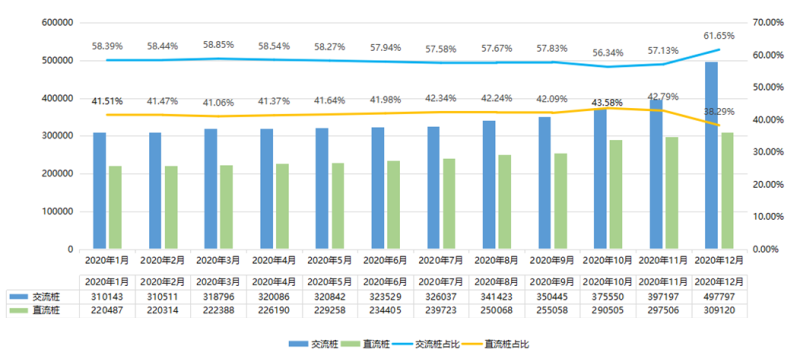 2020年,公共交、直流樁均持續(xù)增長,二者占比總體保持穩(wěn)定,分別在60%、40%左右浮動。公共直流樁支撐了公共充電的主要場景,公共交流樁能進一步提高充電樁密度,可根據(jù)情況靈活布設。12月由于地產(chǎn)合作建樁(主要為交流樁)納入統(tǒng)計,交流樁增量明顯。