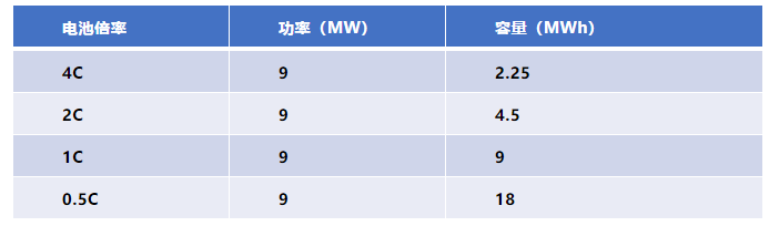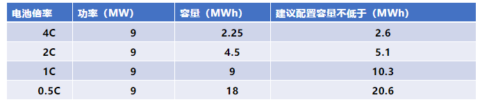 僅從應(yīng)用需求考慮,應(yīng)該使用至少4C以上的電池,當(dāng)然,2C電池配置功率滿足要求的情況下,也可以干4C的活,并且電量更足。同理,1C甚至更低倍率的電池,只要配置功率夠了,都可以滿足調(diào)頻應(yīng)用需求。以30萬機(jī)組,配置9MW儲能系統(tǒng)為例,不同倍率電池的配置方案如下: