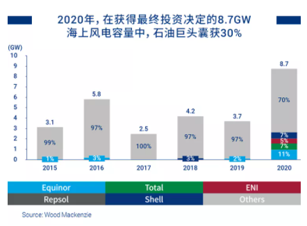石油巨頭進入海上風(fēng)電產(chǎn)業(yè)的時間較晚,在運營容量共計僅有0.7 GW,占除中國以外全球總?cè)萘康?%。項目多處于早期開發(fā)階段,但項目所處的地理范圍最具多元化特征,同時使用包括浮式風(fēng)電在內(nèi)的更高新技術(shù)。僅2020年,在通過最終投資決定的8.7GW海上風(fēng)電項目容量中,其中30%的容量掌控在石油巨頭手中。