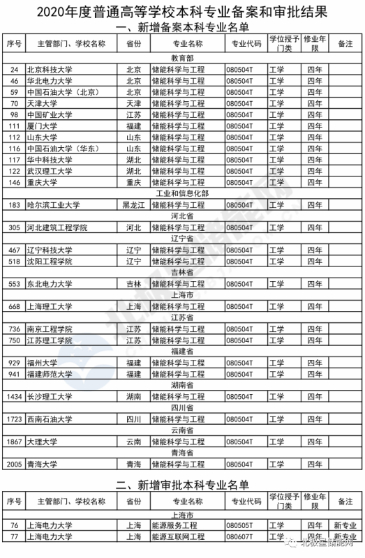 今年,教育部下發(fā)2021年1號(hào)文件《教育部關(guān)于公布2020年度普通高等學(xué)校本科專業(yè)備案和審批結(jié)果的通知》顯示,全國(guó)新增備案本科專業(yè)超過2000個(gè),其中包含北京科技大學(xué)、華北電力大學(xué)、中國(guó)石油大學(xué)、華中科技大學(xué)、武漢理工大學(xué)、哈爾濱工業(yè)大學(xué)、東北電力大學(xué)、福建師范大學(xué)、長(zhǎng)沙理工大學(xué)、青海大學(xué)等等共25所高校增設(shè)了“儲(chǔ)能科學(xué)與工程”專業(yè)。截至目前,全國(guó)共有17省市26所高校設(shè)置了“儲(chǔ)能科學(xué)與工程”專業(yè)。