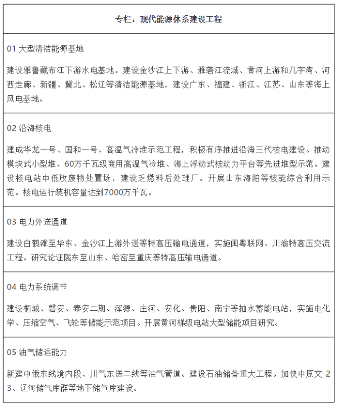 “十四五”規(guī)劃綱要首次設立能源安全指標,并作為約束性指標納入五年規(guī)劃主要指標。綱要草案提出構建現(xiàn)代能源體系,推進能源革命,建設清潔低碳、安全高效的能源體系,提高能源供給保障能力;實施能源資源安全戰(zhàn)略,堅持立足國內(nèi)、補齊短板、多元保障、強化儲備,完善產(chǎn)供儲銷體系;落實2030年應對氣候變化國家自主貢獻目標,制定2030年前碳排放達峰行動方案,錨定努力爭取2060年前實現(xiàn)碳中和;開展智慧能源重點領域試點示范,建設低碳城市;優(yōu)化能源開發(fā)布局和運輸格局,加強能源資源綜合開發(fā)利用基地建設等。規(guī)劃綱要原文中能源相關要點如下: