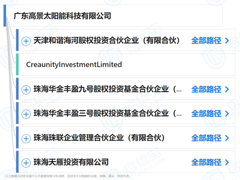 今年3月5日,廣東高景的注冊(cè)資本增至約2.86億元。天津和諧海河股權(quán)投資合伙企業(yè)(有限合伙)(以下簡稱天津和諧海河)、珠海華金豐盈九號(hào)股權(quán)投資基金合伙企業(yè)(有限合伙)(以下簡稱豐盈九號(hào))、珠海華金豐盈三號(hào)股權(quán)投資基金合伙企業(yè)(有限合伙)(以下簡稱豐盈三號(hào))以及Creaunity Investment Limited(以下簡稱Creaunity)新增成為公司股東。