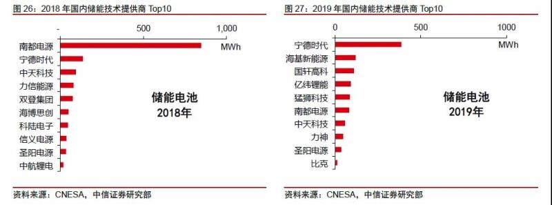 對(duì)比2018-2019年中國(guó)儲(chǔ)能技術(shù)提供商(即電池提供商)Top10企業(yè)的變化即可看到,寧德時(shí)代、國(guó)軒高科、億緯鋰能等國(guó)內(nèi)動(dòng)力電池領(lǐng)先企業(yè),儲(chǔ)能裝機(jī)量均在2019年取得了明顯的同比增長(zhǎng)。