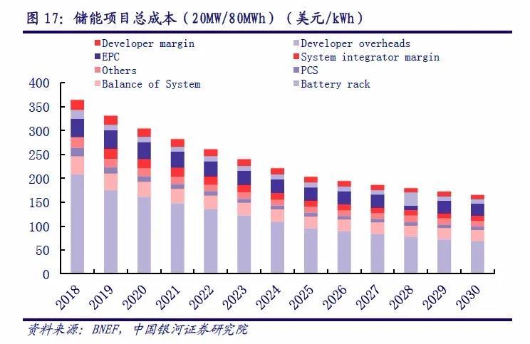 與之對(duì)應(yīng)地,根據(jù)BNEF調(diào)研,2019年一個(gè)完成安裝的4小時(shí)電站級(jí)儲(chǔ)能系統(tǒng),成本范圍在300-445美元/kWh之間。BNEF預(yù)測(cè),2020年單kWh成本仍將高于300美元,至2025和2030年有望降至203美元和165美元。