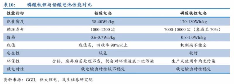 磷酸鐵鋰電池能量密度可達(dá)鉛酸電池的4-5倍,且在安全性、循環(huán)壽命、快速充放性能等方面優(yōu)勢(shì)明顯。盡管目前磷酸鐵鋰電池價(jià)格仍高于鉛酸電池,但在全生命周期成本評(píng)價(jià)體系下,由于擁有更長(zhǎng)的循環(huán)壽命,磷酸鐵鋰電池已幾乎抹平了成本劣勢(shì),且未來(lái)幾年仍有降本空間。