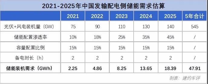 以光伏+風(fēng)電裝機(jī)增量為測(cè)算依據(jù),并考慮儲(chǔ)能配置滲透率逐漸提升,容量配置比例取15%,容量時(shí)長(zhǎng)取2小時(shí),預(yù)計(jì)我國(guó)2021-2025年發(fā)輸配電側(cè)(即電表前端)的儲(chǔ)能裝機(jī)需求約為48GWh。