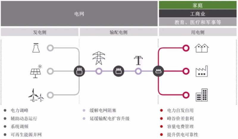 作為平衡整個(gè)電力系統(tǒng)供需關(guān)系的設(shè)備和措施,儲(chǔ)能在發(fā)電側(cè)和輸配電側(cè)的本質(zhì)作用是相同的。儲(chǔ)能布設(shè)在哪個(gè)階段,主要涉及的是利益分配問(wèn)題。因此,國(guó)外機(jī)構(gòu)通常將發(fā)電側(cè)和輸配電側(cè)儲(chǔ)能統(tǒng)一歸類(lèi)為“電表前端儲(chǔ)能”。