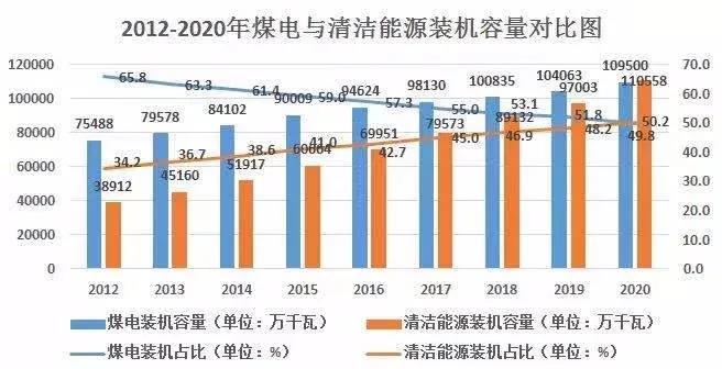 值得注意的是,在連續(xù)多年的清潔發(fā)電高速增長(zhǎng)和煤電緩增長(zhǎng)后,2020年底,中國(guó)煤電總裝機(jī)容量占比首次下降到50%以下。