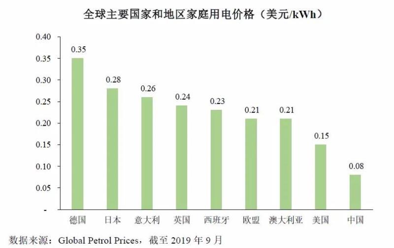 與中國(guó)相比,一些發(fā)達(dá)國(guó)家的居民用電成本高昂。根據(jù)Global Petrol Prices數(shù)據(jù),德國(guó)、日本、英國(guó)、澳大利亞和美國(guó)的居民用電均價(jià)分別為0.38、0.29、0.26、0.25和0.15美元/kWh,而中國(guó)民用電價(jià)僅為0.08美元/kWh。