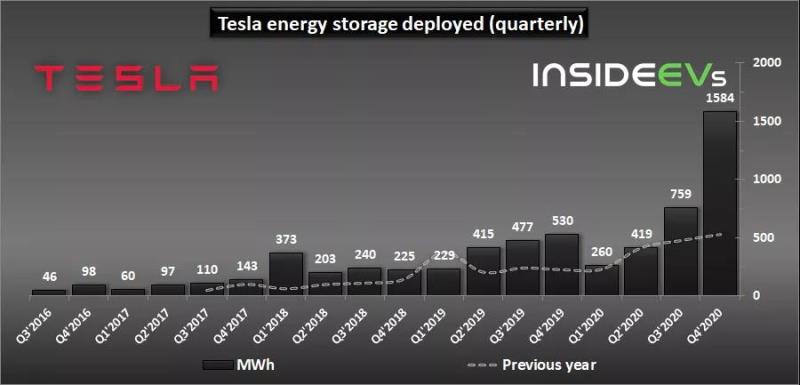 2020年Q4,特斯拉儲(chǔ)能產(chǎn)品裝機(jī)量達(dá)到1.58GWh,同比增長(zhǎng)198.9%、環(huán)比增長(zhǎng)108.7%;2020年全年裝機(jī)總量為3.02GWh,同比增長(zhǎng)83%。