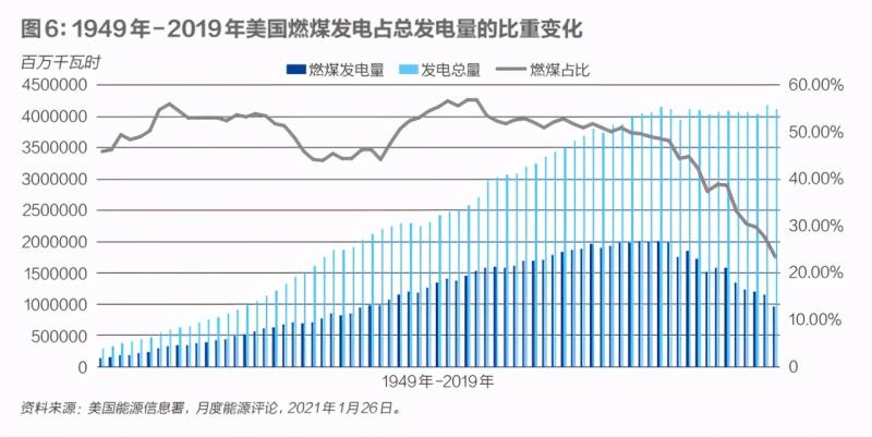 除消費(fèi)總量的結(jié)構(gòu)優(yōu)化外,為二氧化碳排放達(dá)峰做出重要貢獻(xiàn)的還有發(fā)電行業(yè)。美國能源消費(fèi)的第一大戶是發(fā)電部門,2019年占能源消費(fèi)總量的37.03%。從1949年美國能源信息署有統(tǒng)計(jì)數(shù)據(jù)開始直到2015年,煤炭一直是美國發(fā)電用能的第一大來源,但從2016年起天然氣成為第一大發(fā)電用能源,所占的比重不斷提高,2020年高達(dá)40%,可再生能源為21%,核電為19%,煤炭只占19%。