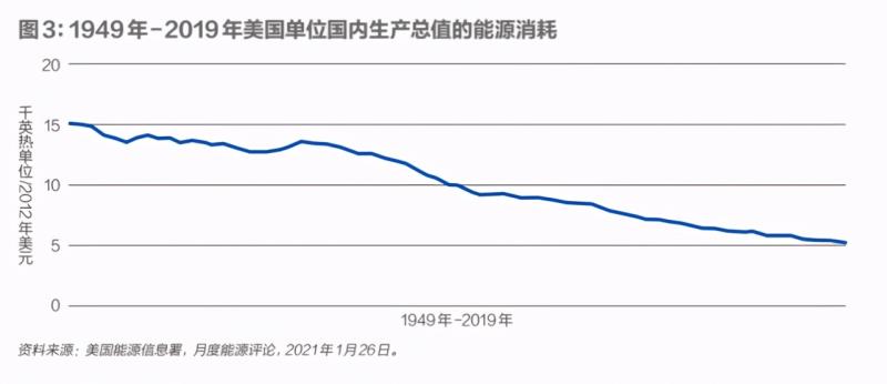 按2012年美元計(jì)算,1949年美國每美元實(shí)際GDP的能源消耗為15180英熱單位。20世紀(jì)50年代至70年代中期,美國單位GDP能耗徘徊在14000至13000英熱單位之間。1985年,下降至9600英熱單位,此后下降速度加快。2019年,美國單位GDP能耗僅為5250英熱單位,僅為1949年的34.58%。