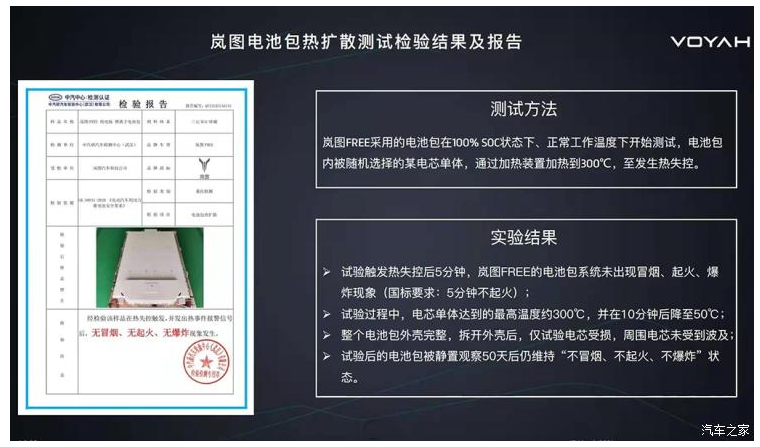 至于一些測試結(jié)果,嵐圖汽車稱嵐圖FREE電池包按照新國標(biāo)要求進(jìn)行熱擴(kuò)散試驗(yàn),在100%SOC狀態(tài)下、正常工作溫度下開始測試,電池包被隨機(jī)選擇的某電芯單體,通過加熱裝置加熱到300℃,至發(fā)生熱失控。結(jié)果是試驗(yàn)觸發(fā)熱失控5分鐘后,電池包系統(tǒng)未出現(xiàn)冒煙、起火、爆炸現(xiàn)象;試驗(yàn)過程中,電芯單體達(dá)到的最高溫度約300℃,并在10分鐘后降至50℃;整個(gè)電池包外殼完整,拆開外殼后,僅試驗(yàn)電芯受損,周圍電芯未受到波及;試驗(yàn)后的電池包被靜置觀察,50天后仍維持“不冒煙、不起火、不爆炸”狀態(tài)。