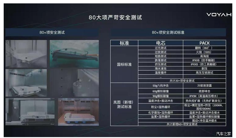 嵐圖汽車表示,其電池包經(jīng)過了“疊加測試”,例如同一塊電池包連續(xù)進(jìn)行高低溫存儲(chǔ)、極限溫度沖擊、等效45萬公里帶載振動(dòng)、六向機(jī)械沖擊、絕緣耐壓、泡水等測試;官方也舉例了一些具體測試,比如在高低溫環(huán)境濕熱循環(huán)及帶載下,同時(shí)實(shí)施振動(dòng)沖擊;有在鹽霧環(huán)境恒定濕熱下,同時(shí)打開濕熱環(huán)境循環(huán)充放電等等。