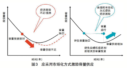 我國當前處于容量市場起步階段,多地對于容量市場的構建進行了有益的探索,同時也暴露出一些問題。山東省將容量成本按照政府制定的容量補償價格從用戶側收取,參與電力現(xiàn)貨市場的煤電機組試行容量補償電價,標準暫定為0.0991元/千瓦時(含稅),每月按機組的折算容量進行分配,已完成折舊的機組可獲得80%的補償,未完成折舊的機組可獲全部補償,檢修、非停等不可用容量要被扣除。容量補償能緩解一定經(jīng)營壓力,但這種贖買的方式無疑是有缺陷的,管制的靈活性滯后于市場調(diào)節(jié),政府預先制定的容量補償價格未必與市場行情相符,定價過高會增加用戶成本,定價過低則無法對發(fā)電商投資起到激勵作用,政策的變化也會使得市場在振奮和蕭條間來回波動,不利于市場的穩(wěn)定建設。因此,為了更好地激發(fā)容量市場活力,應采用市場化的方式反映容量的價值,來避免系統(tǒng)需要的機組因為經(jīng)營虧損退出和激勵新的靈活性容量投資進入(見圖3)。