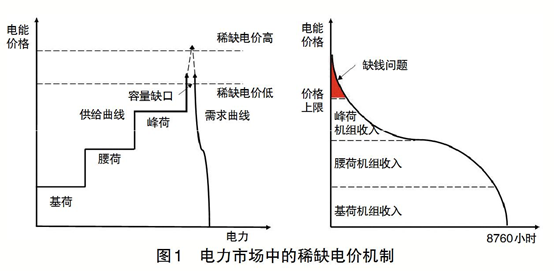 在真實的電力市場中,由于需求側不夠靈活,無法及時響應負荷削減,而且稀缺電價僅反映短時的供需,會給系統(tǒng)長期容量充裕性以及發(fā)電投資帶來較大的風險。同時,失負荷價值和稀缺定價機制仍需通過類似行政的手段確定,計算困難。制定的稀缺電價過高,難以通過市場監(jiān)管消除市場力帶來的價格虛高,且突然飆高的電價會提高用戶的用能成本,并對電力市場的穩(wěn)定性產(chǎn)生沖擊,中國的電力市場對于尖峰時刻極高電價的接受度不高。制定的稀缺電價過低,容量供應商則無法通過用電尖峰時段的收入回收資本成本,發(fā)電容量經(jīng)濟效益持續(xù)虧損會導致設備最終關停,或者無法激勵新的具有靈活性的容量投資,最終導致尖峰時段電力供給不足,電力系統(tǒng)穩(wěn)定性降低甚至出現(xiàn)崩潰。如果一年中出現(xiàn)的尖峰時段價格較低,那么僅參與尖峰時段的機組凈收入將不足以支付大量被需要的電力,從而造成“缺錢”問題(見圖1)。