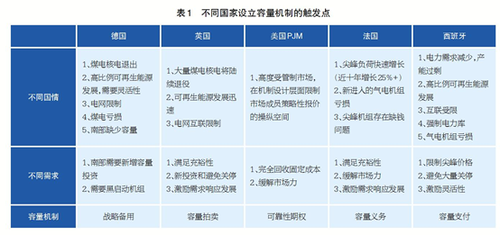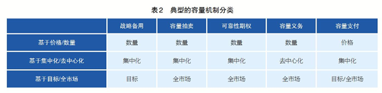 在全球多個運營的電力市場中,為確保發(fā)電容量充裕性采用的方法各不相同,并仍處于改進完善甚至重新構建的過程中。不同國家基于本國不同國情、不同需求(見表1),選擇不同的容量機制,典型的包括戰(zhàn)略備用、容量拍賣、可靠性期權、具有可交換證書的容量義務和容量支付(見表2)。