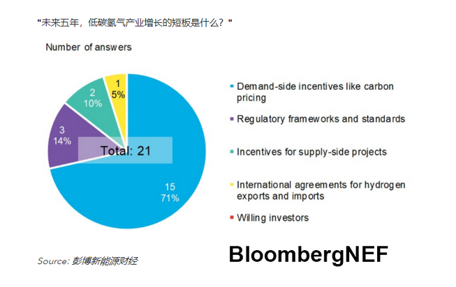 21個受訪者中有15人認(rèn)為,需求方激勵措施是低碳?xì)錃庠谖磥砦迥臧l(fā)展的關(guān)鍵缺失因素。與會者一致認(rèn)為,碳定價至關(guān)重要,但清潔氫氣目前需要100-200歐元(121-242美元)/噸的碳價支撐,才能在部分領(lǐng)域具有競爭力,相當(dāng)于目前歐盟碳價的2.5-5倍,與彭博新能源財經(jīng)《氫能經(jīng)濟展望》中的70-185歐元/噸的預(yù)測大致相當(dāng)。