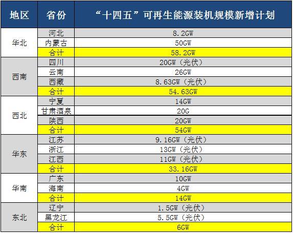 從地域來看,十四五期間將在新能源領(lǐng)域重點(diǎn)發(fā)力的省份,主要位于可再生能源密集的北方和西部,其中,華北地區(qū)、西南地區(qū)和西北地區(qū)排名前三,新能源裝機(jī)規(guī)模新增計(jì)劃分別為58.2GW、54.63GW、54GW。