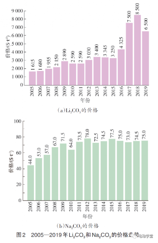 鋰離子電池和鈉離子電池的電極原材料可以分別由碳酸鋰(Li2CO3)和碳酸鈉(Na2CO3)的前驅(qū)體合成。因此,原材料的價(jià)格波動(dòng)會(huì)對(duì)電池成本產(chǎn)生較大影響。Li2CO3和Na2CO3在過去15年的價(jià)格走勢(shì)如圖2所示。圖2中數(shù)據(jù)清楚表明,Na2CO3的價(jià)格比Li2CO3低約兩個(gè)數(shù)量級(jí)。2019年,Li2CO3的價(jià)格為6500$/t而Na2CO3的價(jià)格僅為75$/t。此外,兩種材料的價(jià)格趨勢(shì)也有所不同。2010年以來,Li2CO3的價(jià)格從2590$/t漲至6500$/t,漲幅為151%。同時(shí)期Na2CO3的價(jià)格僅從64$/t上漲到75$/t,漲幅為17%。Li2CO3較高的價(jià)格水平在很大程度上與鋰礦資源的地理位置有限有關(guān)。