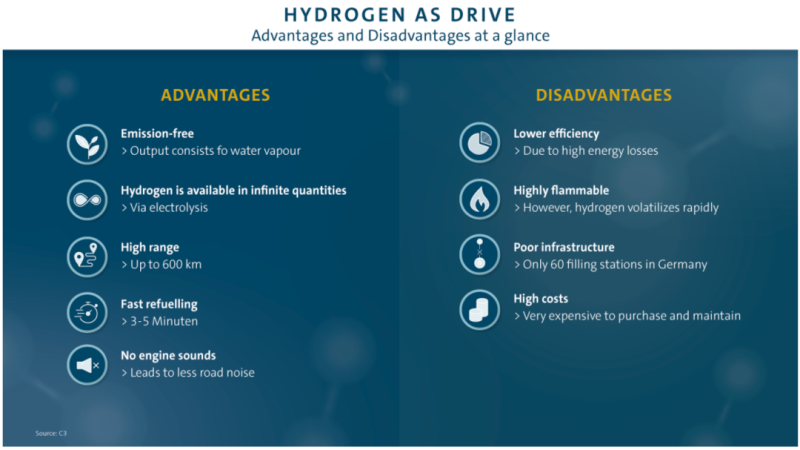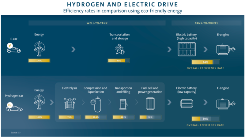 而氫動(dòng)力汽車(chē)的能量損失要大得多:在通過(guò)電解生產(chǎn)氫氣的過(guò)程中,已經(jīng)損失了45%的能量。在剩下的55%的原始能量中,當(dāng)氫在車(chē)內(nèi)轉(zhuǎn)化為電能時(shí),又有55%的能量損失了。這意味著氫動(dòng)力汽車(chē)的能源效率僅為25%至35%。