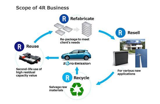 2010年,日產(chǎn)汽車與住友商事株式會(huì)社(Sumitomo Corp.)成立合資企業(yè)4R Energy株式會(huì)社(4R Energy Corp.),專注于電動(dòng)汽車電池的有效再利用,并通過(guò)開(kāi)發(fā)技術(shù)和基礎(chǔ)設(shè)施,以4R模式(再制造(refabricate),再循環(huán)(recycle),再銷售(resell)和再利用(reuse)),發(fā)掘車載電池能量?jī)r(jià)值為其他設(shè)施提供電力。