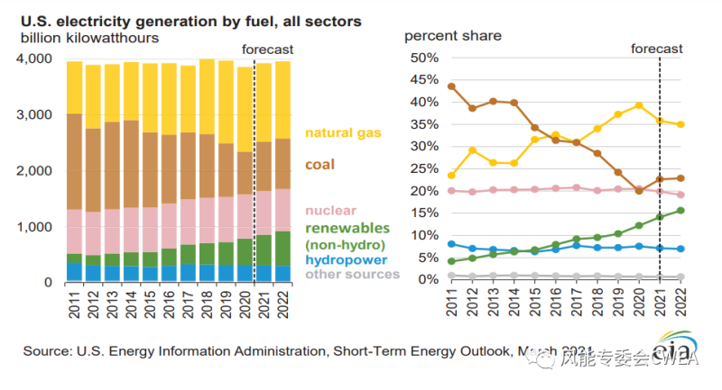 如果將風(fēng)力發(fā)電、太陽能發(fā)電和水電合并到一起,可再生能源的發(fā)電量也已經(jīng)超過了煤電。但美國天然氣發(fā)電仍然處于領(lǐng)先地位。EIA展望報告顯示,到2050年,美國可再生能源發(fā)電占比將提升到42%,超過天然氣發(fā)電。CWEA