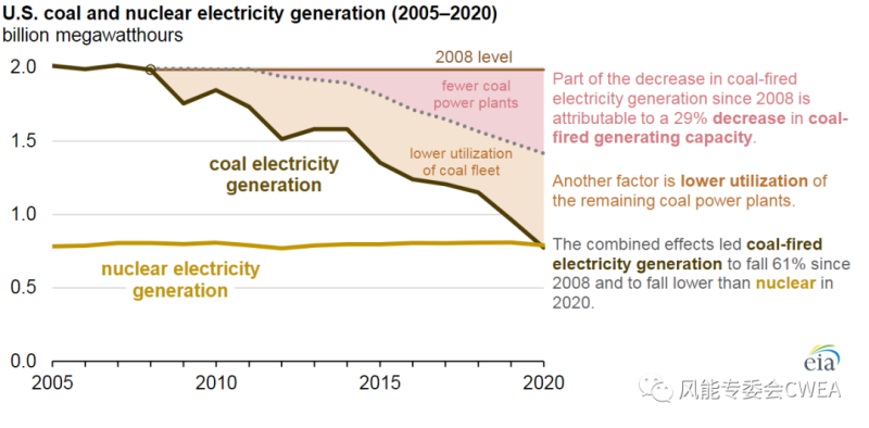 3月18日,美國能源信息署(EIA)發(fā)布的美國最新發(fā)電數(shù)據(jù)顯示,2020年美國燃煤發(fā)電總量為7740億千瓦時,低于天然氣發(fā)電(16000億千瓦時)和核電發(fā)電量(7900億千瓦時)。這是自1949年以來,煤電首次掉出前2名。但EIA也預(yù)計,2021年和2022年美國的燃煤發(fā)電量將增加,而核電發(fā)電量將減少。