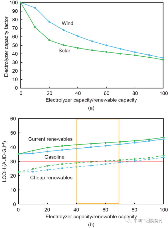 圖2 堿性電解器的容量因子(a)和堿性電解槽與提供可再生能源的發(fā)電機之間的LCOH(b)。發(fā)電數(shù)據(jù)來自澳大利亞國家電力市場中兩個正在運營的風力和太陽能發(fā)電廠