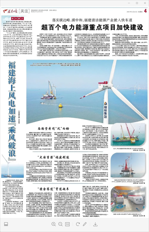 中國(guó)儲(chǔ)能網(wǎng)訊:3月25日,福建日?qǐng)?bào)4版整版刊發(fā)《落實(shí)碳達(dá)峰、碳中和,福建清潔能源產(chǎn)業(yè)駛?cè)肟燔嚨馈賯€(gè)電力能源重點(diǎn)項(xiàng)目加快建設(shè)》《福建海上風(fēng)電加速“乘風(fēng)破浪”》。