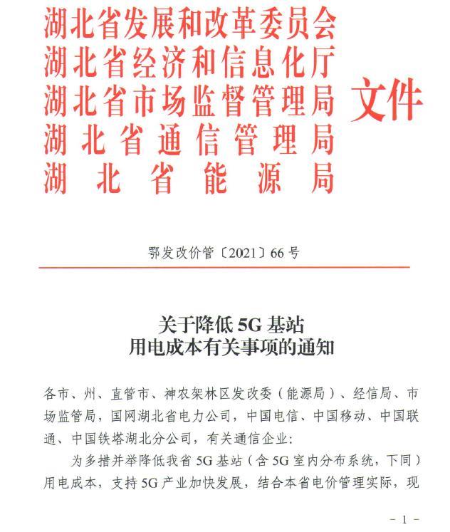 3月10日,湖北省發(fā)改委、經(jīng)信廳、市場(chǎng)監(jiān)督局、通信管理局以及能源局等五部門聯(lián)合印發(fā)關(guān)于降低5G基站用電成本有關(guān)事項(xiàng)的通知,多措并舉降低湖北全省5G用電成本,支持5G產(chǎn)業(yè)加快發(fā)展。3月10日,湖北省發(fā)改委、經(jīng)信廳、市場(chǎng)監(jiān)督局、通信管理局以及能源局等五部門聯(lián)合印發(fā)關(guān)于降低5G基站用電成本有關(guān)事項(xiàng)的通知,多措并舉降低湖北全省5G用電成本,支持5G產(chǎn)業(yè)加快發(fā)展。