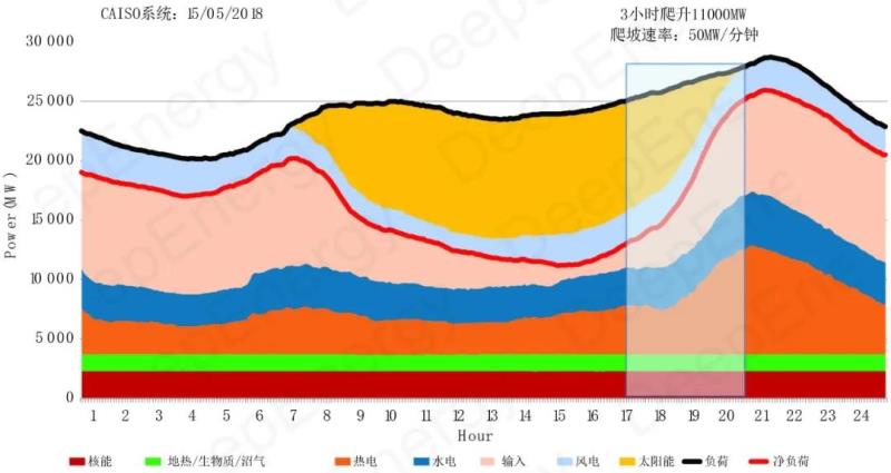 降坡調(diào)節(jié)發(fā)生在日出后早7點(diǎn)左右,此時(shí)太陽(yáng)能發(fā)電開始替代傳統(tǒng)發(fā)電。在下午5點(diǎn)左右太陽(yáng)下山時(shí),太陽(yáng)能發(fā)電停止,電網(wǎng)運(yùn)營(yíng)商必須調(diào)度資源來(lái)滿足第三次也是最陡峭的日常調(diào)節(jié),大約需要在3小時(shí)內(nèi)調(diào)度1100MW的發(fā)電能力來(lái)滿足需求。這需要系統(tǒng)有50MW/分鐘的爬坡能力和非常靈活的電力系統(tǒng)。