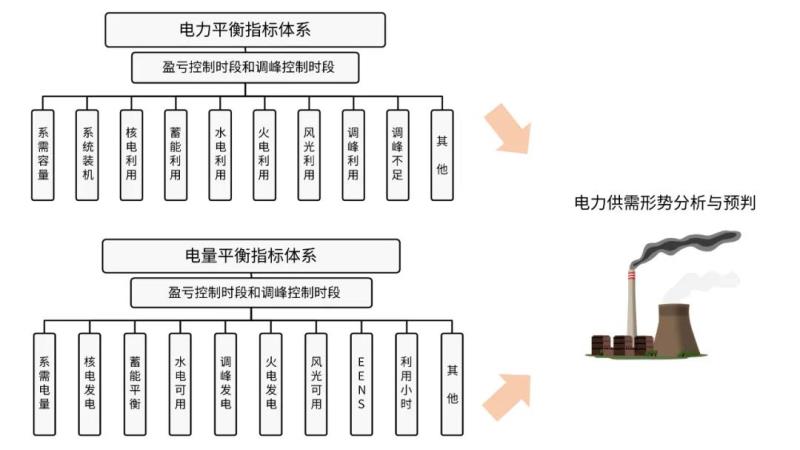 東北電力中短期供需預(yù)判的監(jiān)管指標(biāo)體系包括電力電量平衡指標(biāo)體系和綜合監(jiān)管指標(biāo)體系設(shè)計(jì)?;诰?xì)化運(yùn)行模擬的結(jié)果,通過構(gòu)建電力電量平衡指標(biāo)體系對電力供需形勢進(jìn)行分析預(yù)判(見圖3)。