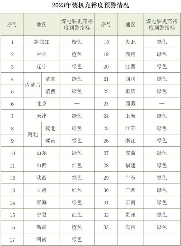 但根據(jù)國家能源局2020年2月26日發(fā)布的《2023年煤電規(guī)劃建設(shè)風(fēng)險預(yù)警的通知》,煤電裝機充裕度預(yù)警指標(biāo)基于2023年各省、自治區(qū)、直轄市電力系統(tǒng)備用率,分為紅色、橙色、綠色三個等級。煤電裝機明顯冗余、系統(tǒng)備用率過高的為紅色預(yù)警;煤電裝機較為充裕、系統(tǒng)備用率偏高的為橙色預(yù)警;電力供需基本平衡或有缺口的、系統(tǒng)備用率適當(dāng)或者偏低的為綠色。