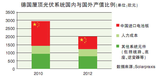 德國根本不用擔(dān)心國內(nèi)市場。以2010年為例,當(dāng)年德國屋頂太陽能組件的市場價(jià)格約為2900歐元/千瓦。據(jù)柏林一家頂尖的可再生能源工程服務(wù)公司Solarpraxis統(tǒng)計(jì),在德國安裝的屋頂光伏系統(tǒng)中,線路、底座和逆變器多半是國內(nèi)原產(chǎn),這些部分占了整個(gè)系統(tǒng)造價(jià)的近一半。目前從中國進(jìn)口的太陽能電池板造價(jià)已經(jīng)跌到700歐元/千瓦,但上述其他組件價(jià)格卻沒怎么大跌。如此推算,德國國內(nèi)市場份額實(shí)際上在不斷擴(kuò)大,電池板在裝機(jī)成本中所占比例已經(jīng)下降了許多。