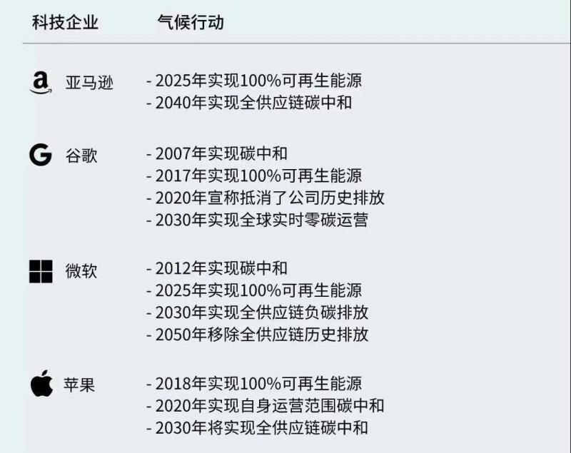 數(shù)據(jù)中心的市場前景廣闊,但同時對能耗和減排也提出了更高的挑戰(zhàn)。2018年中國數(shù)據(jù)中心總用電量為1609億千瓦時,約占中國全社會用電量的2%,總碳排放量達到9855萬噸,預計到2023年,中國數(shù)據(jù)中心總碳排放將達到1.63億噸[15]。在中央于2020年9月提出“雙碳”目標后,科技公司對于電力采購的規(guī)劃深受中央指引影響。目前,包括騰訊和螞蟻集團等互聯(lián)網(wǎng)科技企業(yè)已陸續(xù)提出啟動碳中和規(guī)劃。而早在2018年 ,國際互聯(lián)網(wǎng)企業(yè)蘋果、谷歌就已實現(xiàn)100%可再生能源目標。使用清潔電源供應、實現(xiàn)全供應鏈凈零碳排放早已成為這些數(shù)字科技企業(yè)的重要綠色名牌。