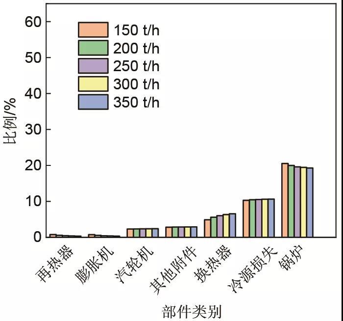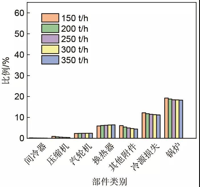 對比150、200、250、300、350 t/h抽汽量的集成系統(tǒng)強化供電階段基本點?分析,從圖16可以看出,各類部件?損失占輸入?的比例大小與強化供熱階段一致,鍋爐最大,冷源損失次之,分別為20%左右和10.5%左右。鍋爐的?損失最大,主要是由于燃燒損失以及換熱損失的不可逆性損失導致的。最小的是間熱器和膨脹機部件,均為0.5%左右。