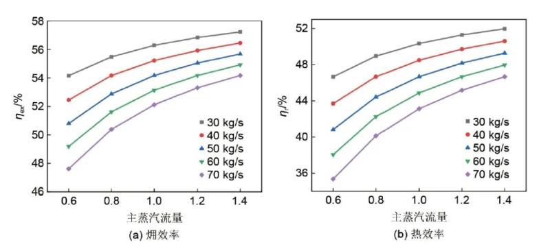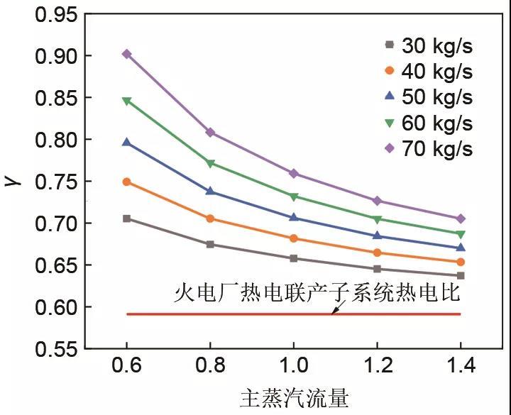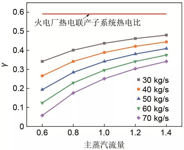 (2)隨著空氣流量從30 kg/s增大到70 kg/s,在強化供熱階段,熱電解耦指標熱電比增大0.07~0.20左右;強化供電階段,熱電比減小0.14~0.28左右。隨著空氣流量的增大,在強化供熱和強化供電階段,熱電比隨主蒸汽流量的變化率均增大;對于某一特定的主蒸汽流量,集成系統(tǒng)性能隨空氣流量的變化規(guī)律,與基準主蒸汽流量下的變化規(guī)律一致;