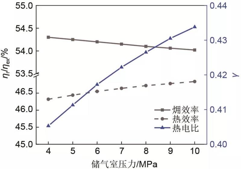 圖9為儲氣室壓力對集成系統(tǒng)熱效率、?效率和熱電比的影響,可以看出儲氣室壓力對各性能參數(shù)的影響較小。當儲氣室壓力從4 MPa增大到10 MPa時,集成系統(tǒng)總過程的?效率降低0.3%,這是因為隨著儲氣室壓力增大,壓縮機耗功隨之增大,電能向熱能和壓力勢能轉(zhuǎn)換時的損失也略有增大,導致?效率呈現(xiàn)減小趨勢;而熱效率增大0.5%,是因為隨著壓縮機背壓的增大,壓縮機出口空氣溫度升高明顯,導致總系統(tǒng)向外輸出的熱能增大,但系統(tǒng)的輸入變化并不明顯,所以集成系統(tǒng)總過程的熱效率隨著儲氣室壓力的增大而增大;集成系統(tǒng)總過程熱電比增大0.03,隨著儲氣室壓力增大,能量轉(zhuǎn)換過程中的損失增大導致集成系統(tǒng)總過程的凈輸出電能逐漸減小,而強化供熱過程輸出的熱能逐漸增大,所以集成系統(tǒng)總過程的熱電比呈現(xiàn)增大趨勢。