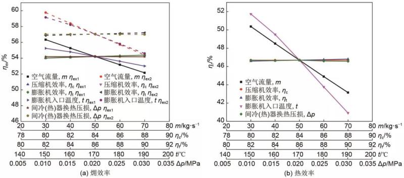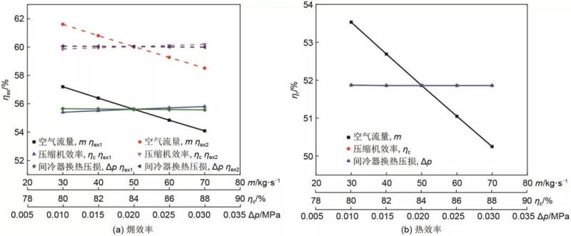 (3)總過程。從圖8中可以看出,由于換熱站換熱溫度不對等引起的換熱?損失,ηex1比ηex2小3%左右,采暖抽汽與用戶采暖溫度的差值會造成較大的能量損失。隨著進入壓縮空氣儲能子系統(tǒng)壓縮機和膨脹機的空氣流量的增加,集成系統(tǒng)總過程的?效率呈現(xiàn)逐步減小的趨勢,當空氣流量從30 kg/s增加到70 kg/s時,總過程的?效率從56.3%減小到52.2%;熱效率從50.4%減小至43.2%。這是因為隨著空氣流量的增加,有更多的電能完成從電能到熱能再到電能的轉(zhuǎn)化,即能量品位從高到低再到高,造成了能量的浪費,所以總過程?效率和熱效率呈現(xiàn)減小趨勢。當壓縮空氣儲能子系統(tǒng)的壓縮機效率從0.82增加到0.90時,總過程?效率增加0.4%;熱效率幾乎不變。這是由于當壓縮機效率提高時,壓縮機的耗功會相應(yīng)降低,即高品位的電能向低品位的熱能轉(zhuǎn)化的量減少,從而導致總過程?效率增加。當壓縮空氣儲能子系統(tǒng)的膨脹機效率從0.84增加到0.92時,總過程的?效率增加0.35%,熱效率增加0.2%。原因是膨脹機效率的提高,會有更多的熱能轉(zhuǎn)化為電能,能量品位得以提升,故總過程的?效率和熱效率呈現(xiàn)增加態(tài)勢。膨脹機入口溫度從150 ℃增加至190 ℃時,總過程?效率降低2.2%;當改變間冷器和再熱器兩端的換熱壓損使其從0.01 MPa增加到0.03 MPa時,總過程?效率在54.2%左右,熱效率在46.6%左右;這是因為換熱損失隨之增加,但由于其影響較小,故總過程的?效率輕微減小,幾乎沒有影響。