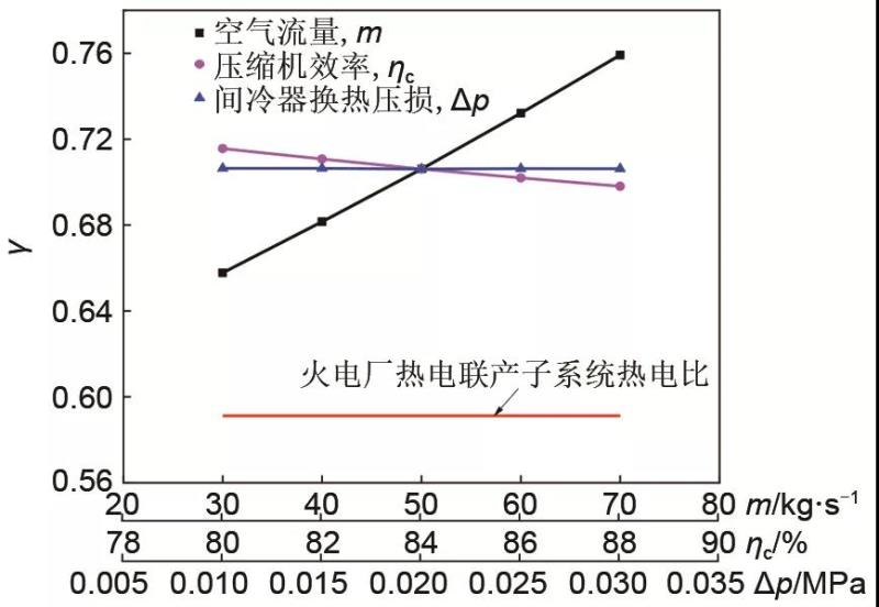 由圖5中可以看出,隨著進入壓縮機和膨脹機的空氣流量的增加,集成系統(tǒng)強化供熱階段的熱電比逐漸增加,空氣流量從30 kg/s增加到70 kg/s時,熱電比從0.6578增長到0.7592;這是因為增大空氣流量時,產(chǎn)生的壓縮熱隨之增大,間冷器可以收集到的熱量增多,可向用戶提供的熱量也逐步增加,所以熱電比的變化逐步增加且增幅明顯。當壓縮機效率從0.82向0.90增大時,集成系統(tǒng)強化供熱階段熱電比略有減小;原因是當壓縮機效率升高時,產(chǎn)生的壓縮熱有所減小,可收集的提供給用戶的熱量減小,導致熱電比輕微降低。當間冷器兩端的換熱壓損從0.01 MPa增加到0.03 MPa時,換熱損失有所增加,從而導致熱電比有輕微下降。