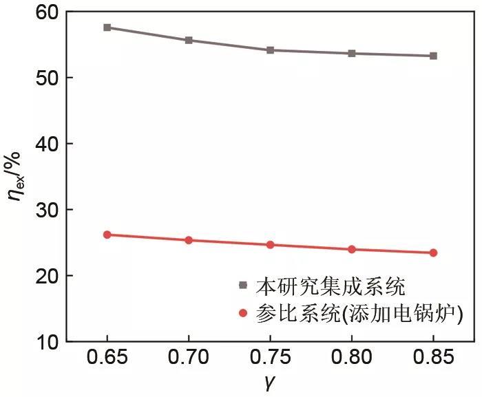 在計算壓縮空氣儲能子系統(tǒng)各部件參數(shù)對新型集成系統(tǒng)?效率的影響時,為對比由于換熱站換熱溫度不對等導致的換熱?損失大小,進行了兩個不同?效率的計算,區(qū)別在于一個采用用戶側(cè)采暖供回水的?值差做為輸出熱負荷?值,取為ηex1;另一個采用采暖抽汽供回的?值差做為輸出熱負荷?值,取為ηex2。